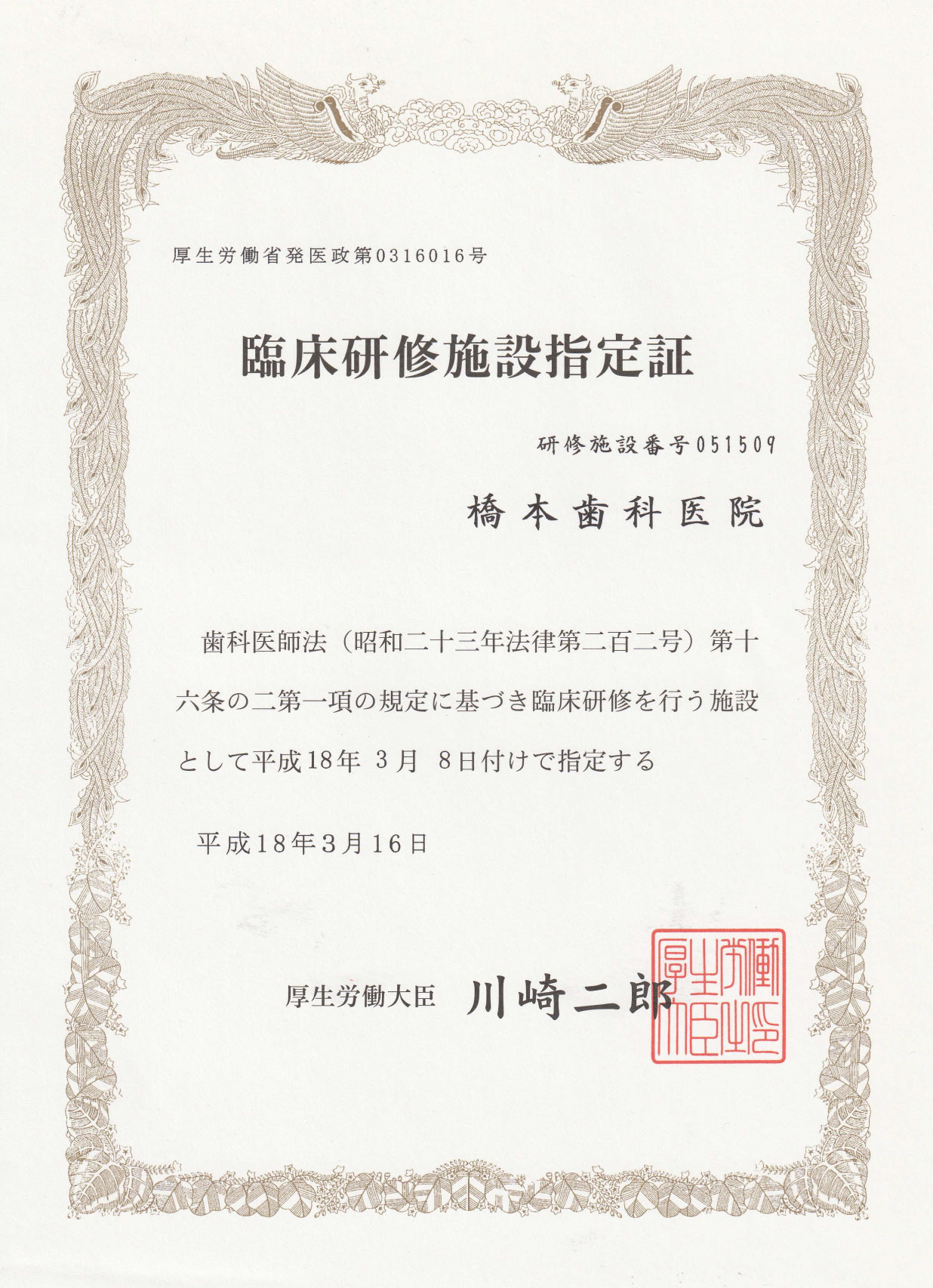 ハシモトデンタルオフィスは、歯科医師や歯科衛生士の人数、設備、実績など、様々な基準をクリアし、厚生労働省より歯科医師の臨床研修を行なう施設として、平成18年3月8日付けで指定されました。