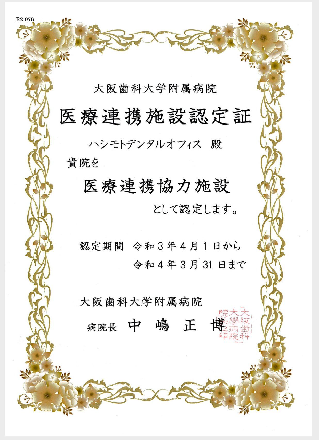 ハシモトデンタルオフィスは、大阪歯科大学附属病院より医療連携を行なう施設として、認定されました。