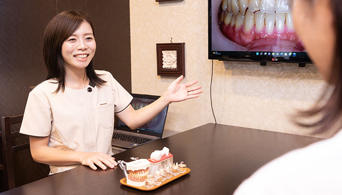 当院では治療内容の説明を十分に行い、納得して頂いてから治療を始めることで、患者様の恐怖心を取り除くことができると考えております。 初診時にスッタッフがお悩みや相談をお伺いします。治療にかかる期間や方法、費用についてなど、今さら誰にも聞けないようなことから専門的なことまで、ご遠慮なくお尋ねください。