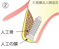 GBR法とは、あごの骨の高さや幅が不足している部分に、メンブレンという人工膜を覆って骨が再生するスペースを確保し、その中に人工骨を填入して、骨の再生を促す治療のことです。