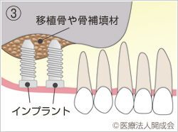 骨が少ない場所に対してインプラントの手術前、あるいは手術と同時にインプラントの周囲の骨を増やす治療があります。