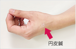 円皮鍼とは皮膚に刺す鍼のことで、丸いテープにとても細くて短い鍼がついています。皮膚に刺してあるだけなので動いても痛みはなく、お風呂に入ったりと普段通りの生活をすることが出来ます。(約1週間ほど貼ったままで過ごせます)