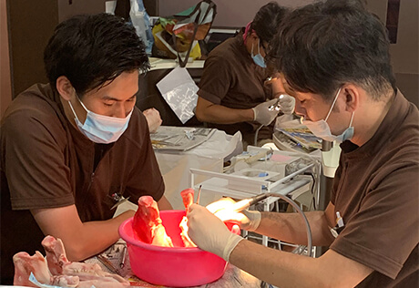 理事長がそれぞれのドクターの手技の良い点・悪い点の指摘をし、指導しました。また、GBRの講義、特にフラップデザイン減張切開シザーステクニックなどについても指導がありました。