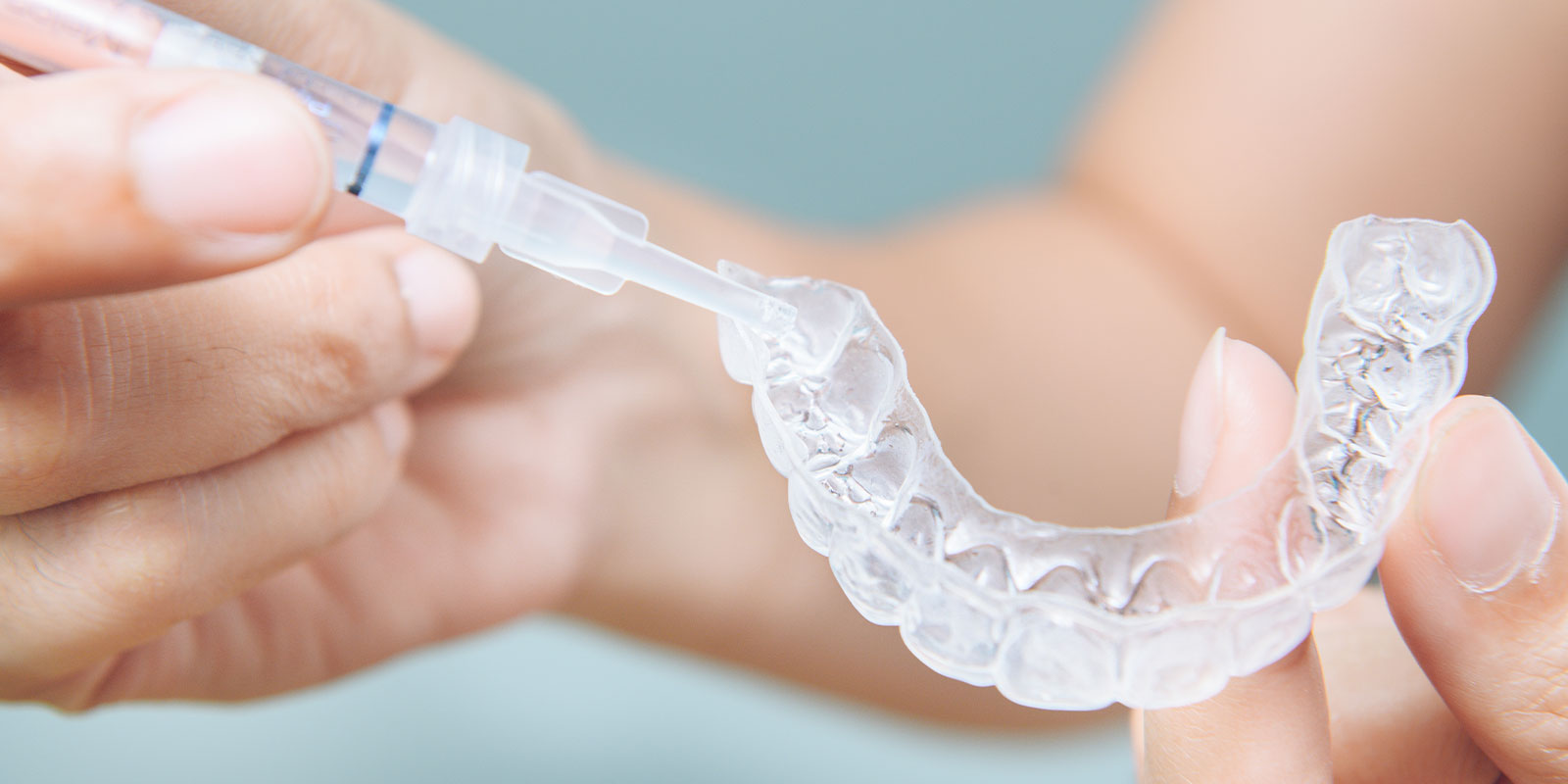ホワイトニング剤を流し込んだマウスピースを装着して歯を白くするホワイトニングです。